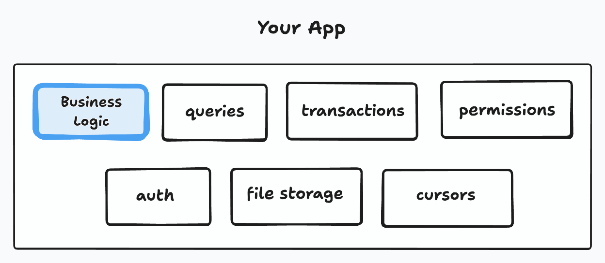 To build an app you write two kinds of code. The business logic that solves your specific problem, and the generic stuff that most apps have to take care of: authenticating users, making queries, running permissions, uploading files, and executing transactions.