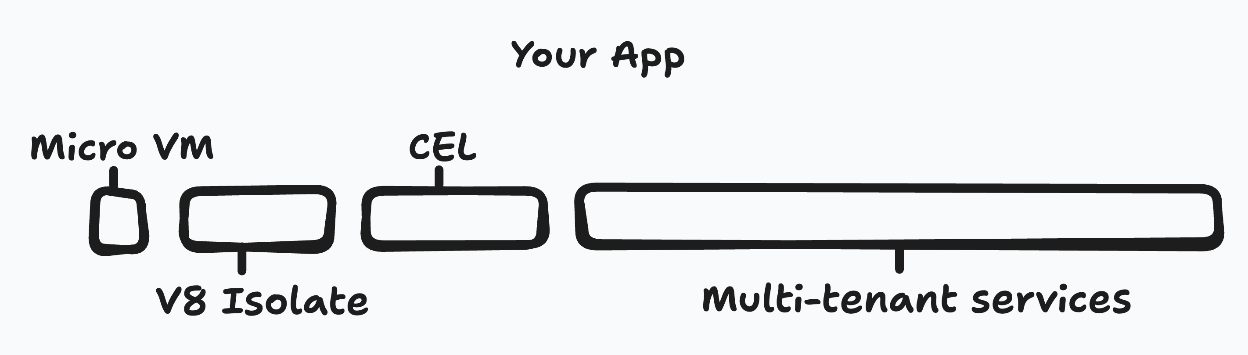 Shared abstractions could be served from multi-tenant services on big machines. Permissions could use CEL, javascript callbacks could run on V8 Isolates, and shell commands run on Micro VMs. If we did that, 20,000 apps with 1 active user would cost about the same as 1 app with 20,000 users.
