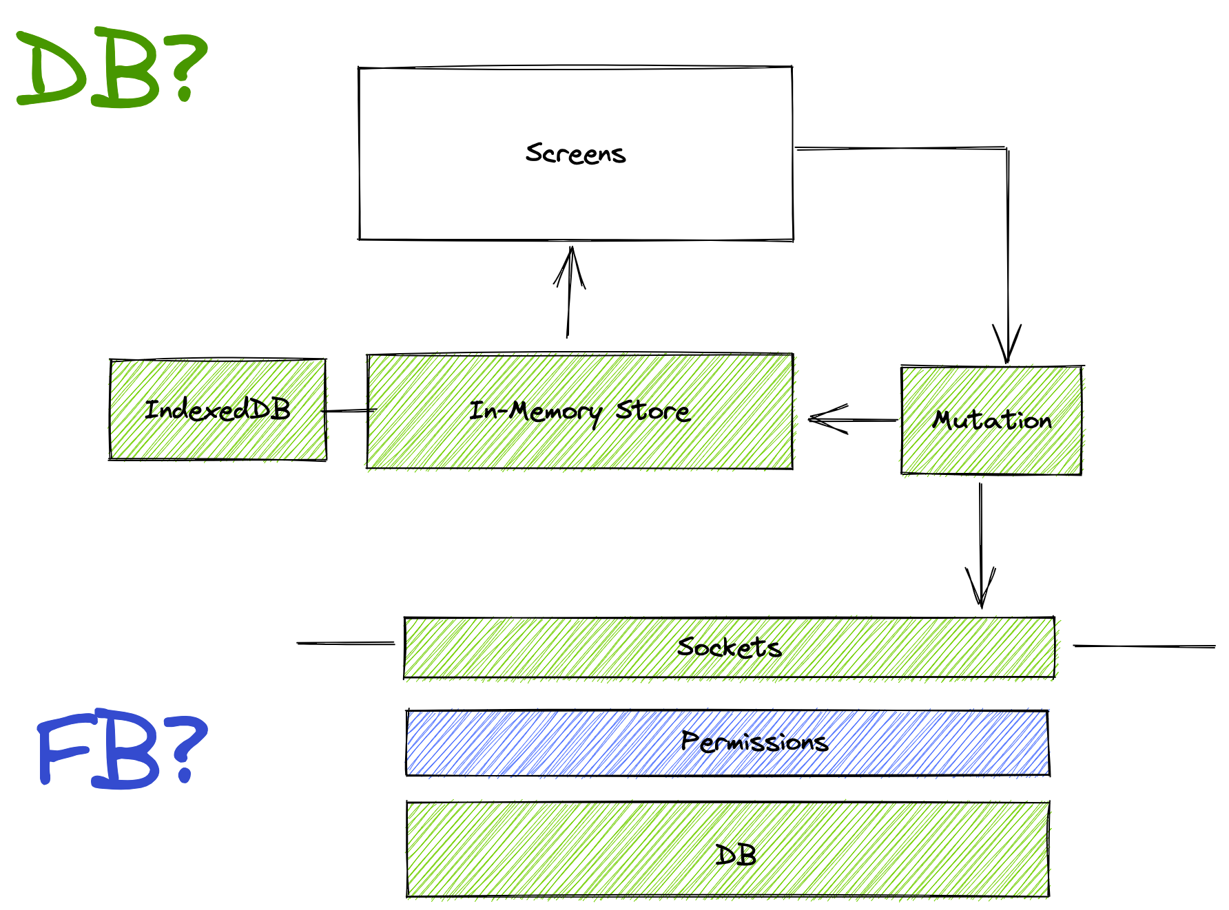 But we need our app to work offline too. So we back our store with durable storage. For web this is IndexedDB. When our app loads, we hydrate the store with what was saved before. This is what enables offline-mode and amortizes read latency.